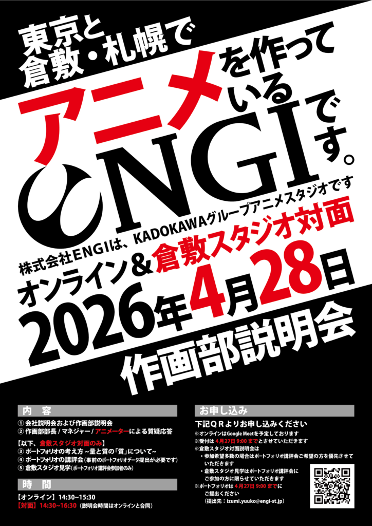 対象:2027年以降、アニメーターとしてENGIへの入社を志望される学生の方(28卒および29卒、または既卒および第二新卒も参加可能)